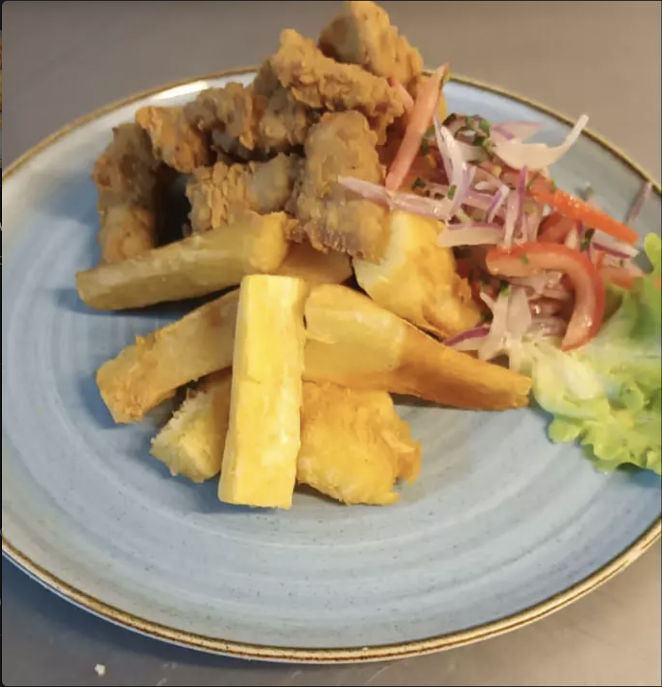 pescado apanado en harina, yuca frita, sarsa criolla y tártara