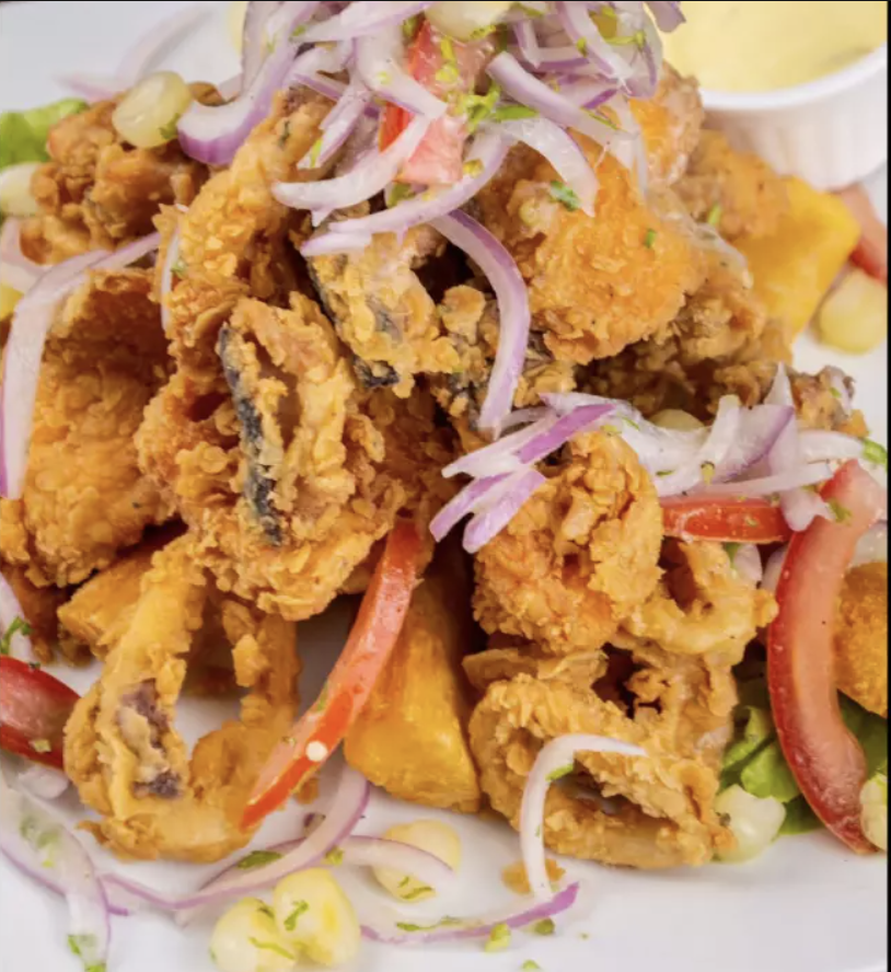 calamar apanado en harina, yuca frita, sarsa criolla y tártara