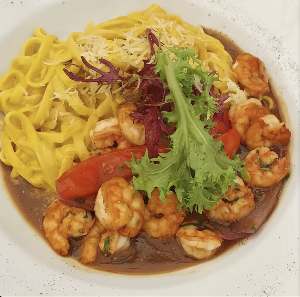 Pasta, camarones, queso parmesano, salsa huancaína, cebolla morada en gajo, tomate, cilantro y salsa de soya