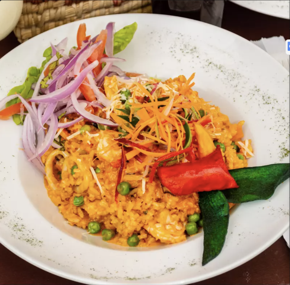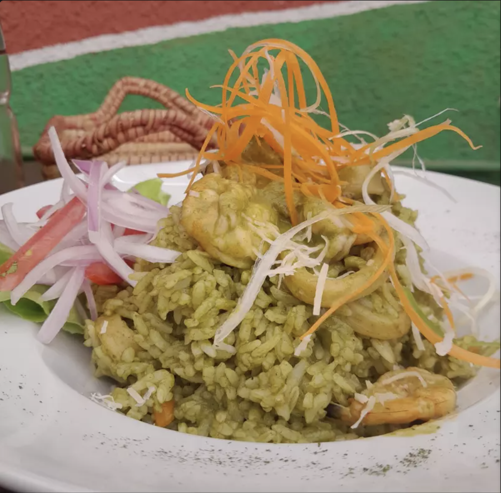 Arroz cocido, zanahoria, arveja, cilantro, chicha de jora, maricos y sarsa criolla.