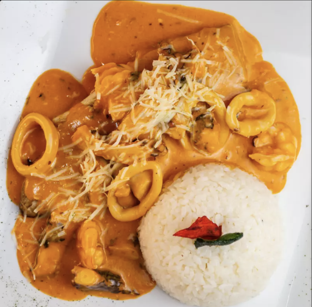 Reineta a la plancha , salsa de mariscos , ají amarillo, arroz