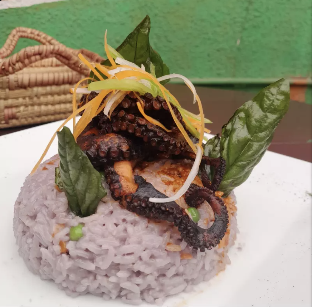 Arroz cocido, zanahoria, arveja, salsa de olivo y pulpo a la parrilla