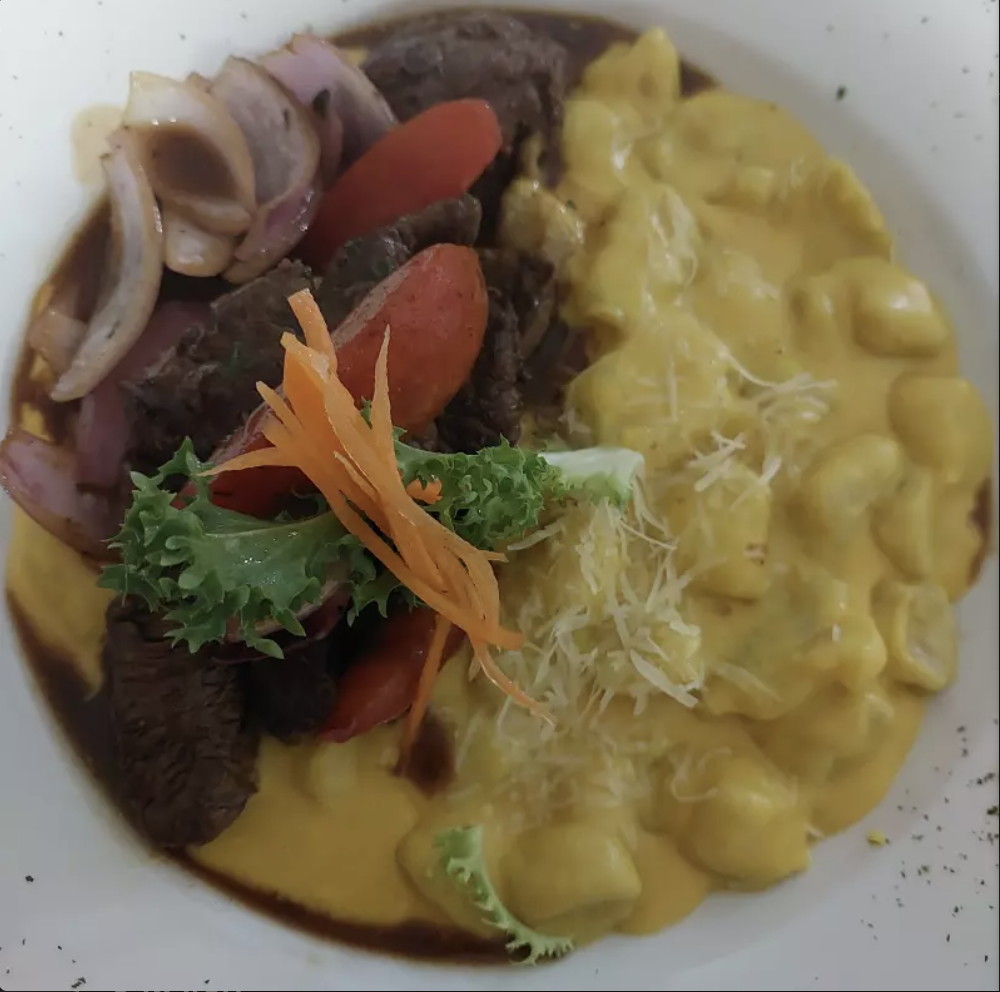 Salsa de huancaína, filete de lomo, cebolla morada, tomate, cilantro, salsa de soya y queso parmesano.