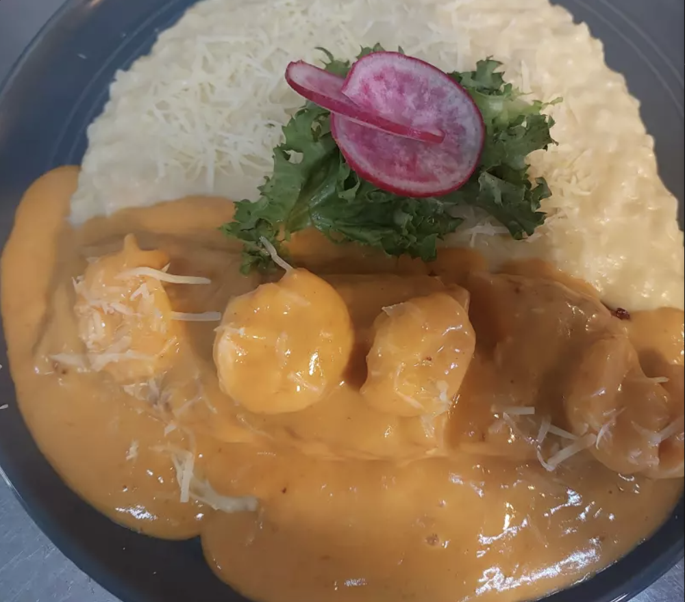 Risotto en salsa huancaína con nuestra tradición camarón salteado