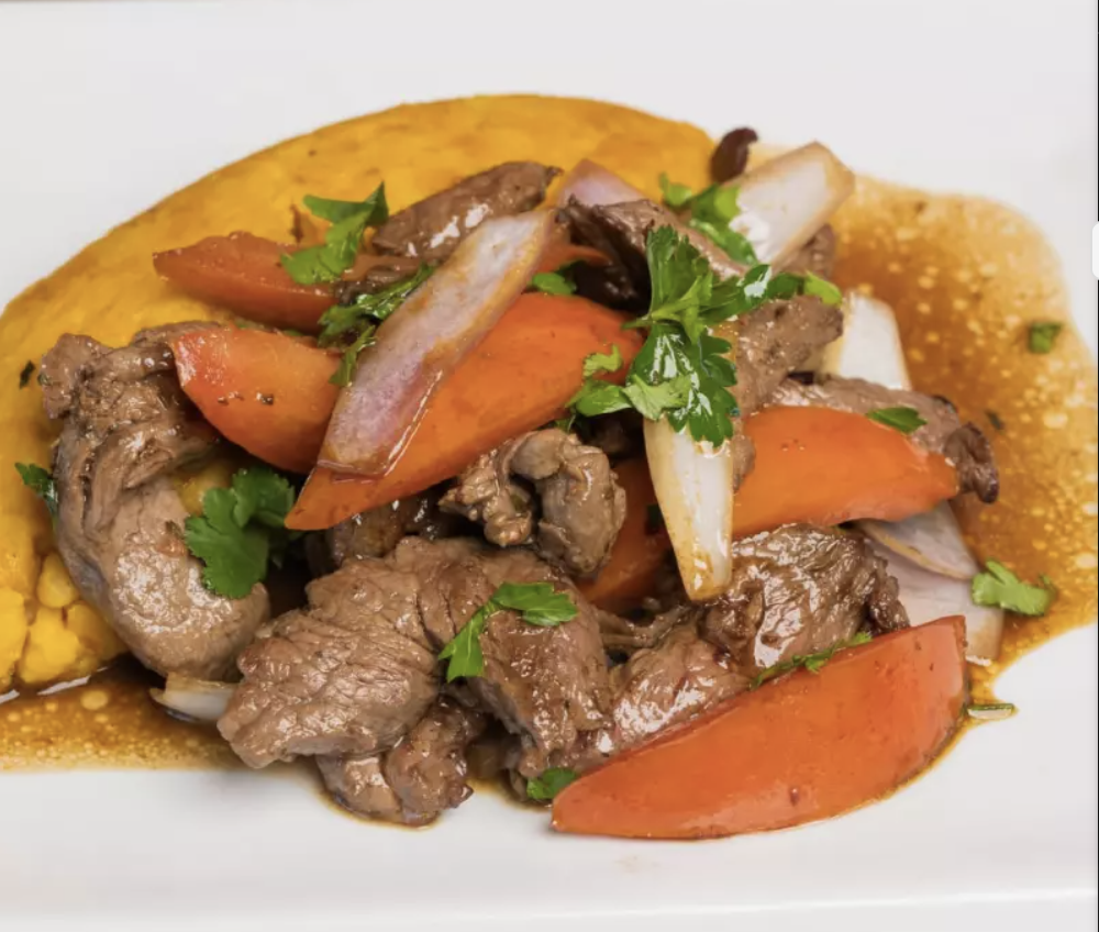 porotos dorados con arroz, especies peruanos, filete de lomo, tomate, cebolla, cilantro.